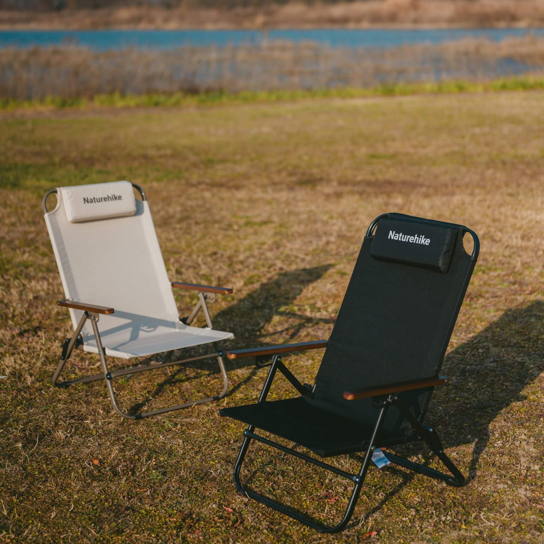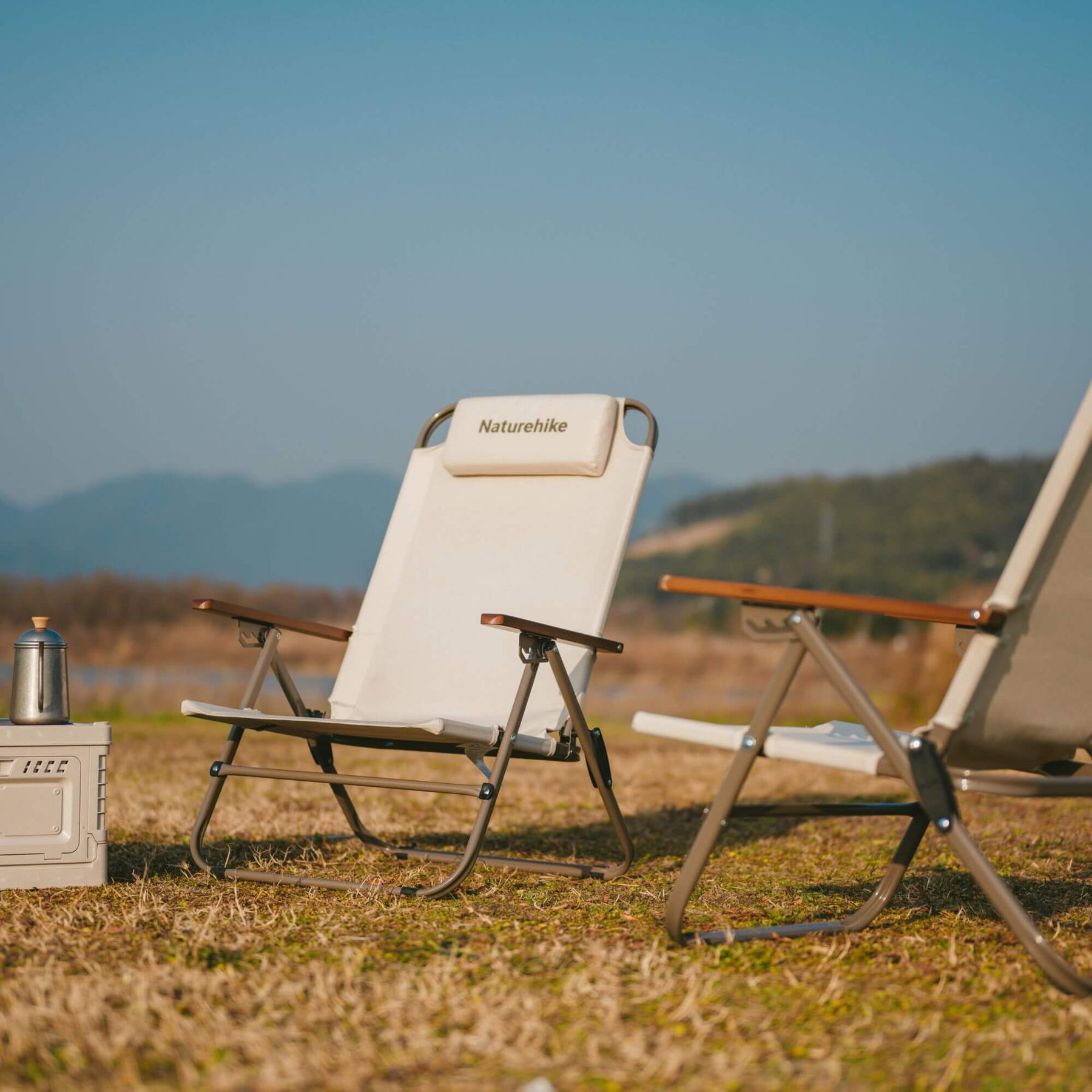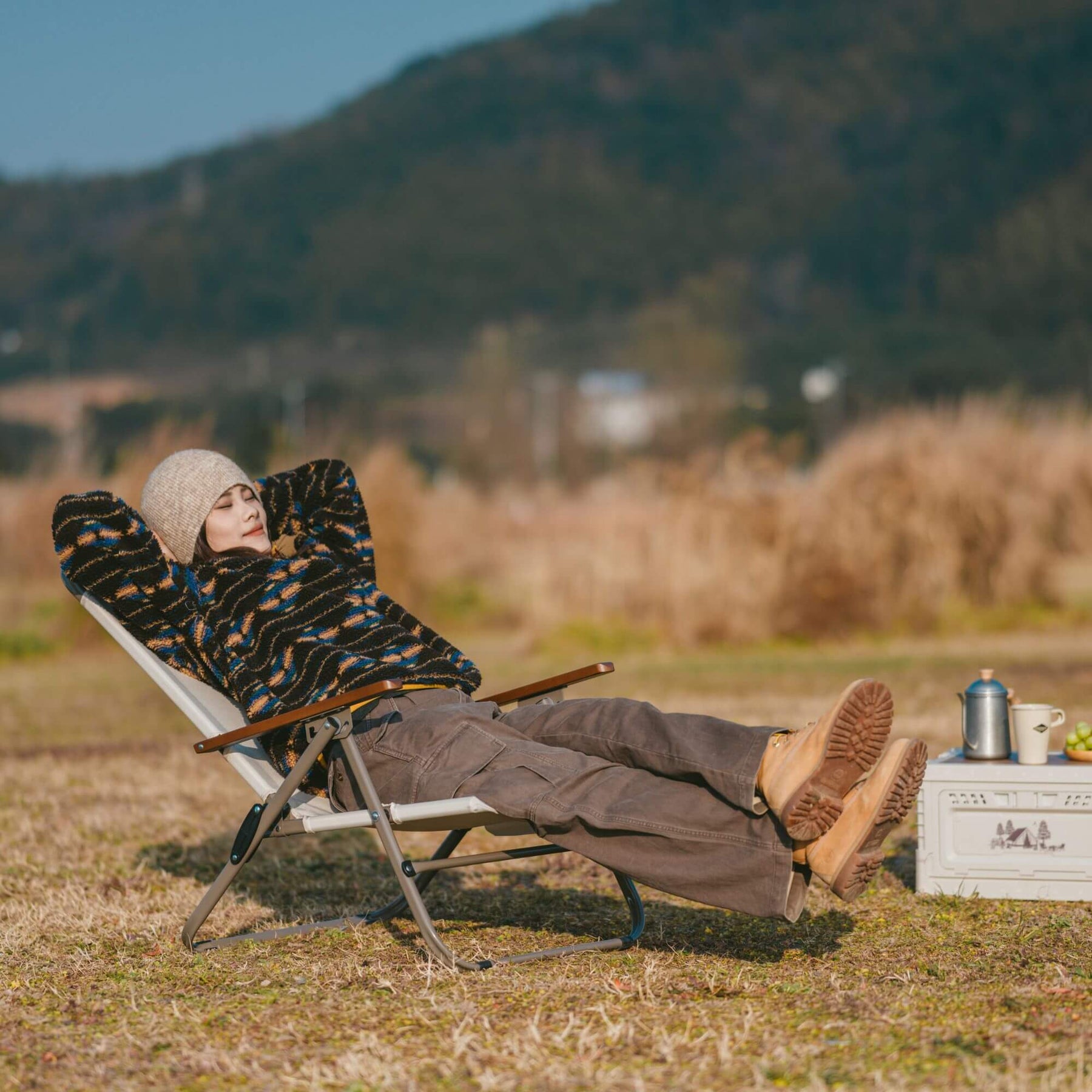 Son centre de gravité bas favorise une position stable et détendue, idéale pour étirer les jambes. La structure en acier épais assure une solidité à toute épreuve, et malgré cette robustesse, la chaise reste facile à transporter d’une seule main. Les accoudoirs en hêtre élargi offrent une sensation naturelle et agréable au toucher.